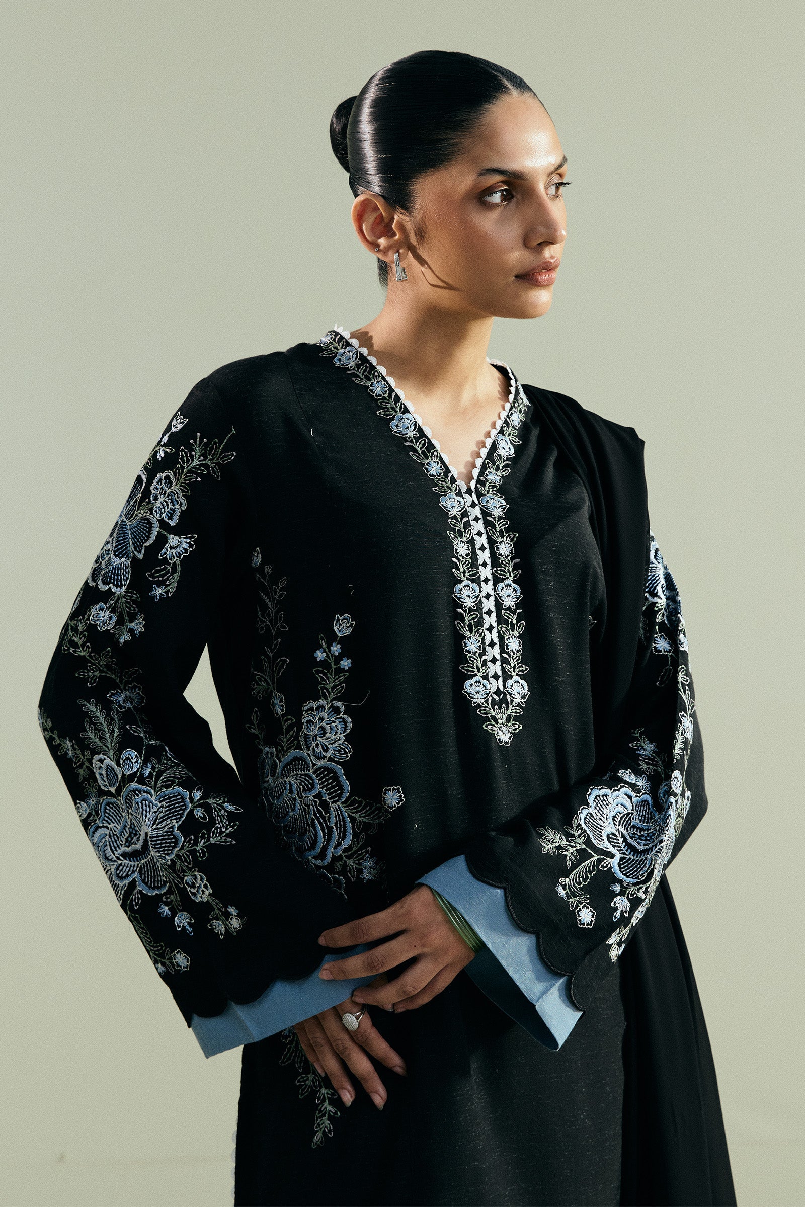 This classic black kurta is adorned with embroidery on the front, highlighted with a pop of color in the stitching for a subtle yet striking detail. It is paired with a traditional farshi shalwar that adds volume and grace. The look is completed with a tonal dupatta featuring delicate embroidery, tying the outfit together with understated elegance.