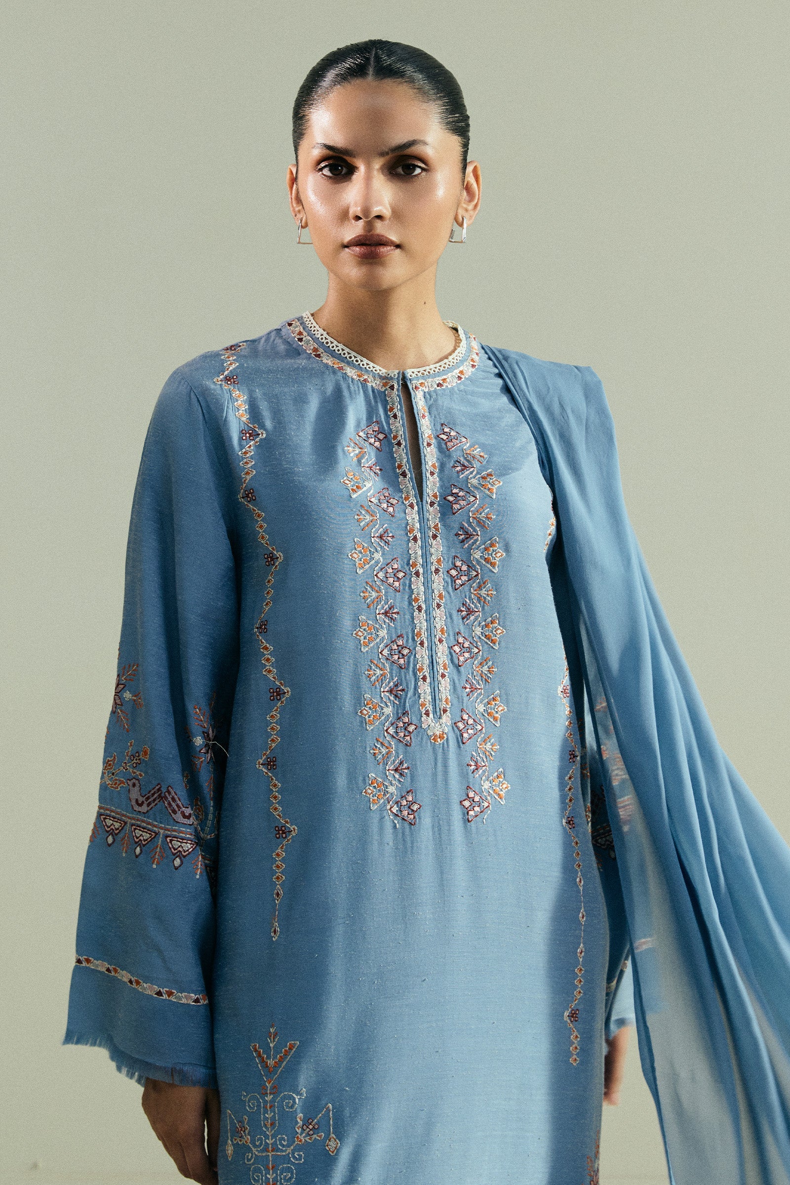 This loose-fit blue long shirt features kantha embroidery across the front, highlighting its artisanal detail and texture. It is paired with cropped straight pants finished with delicate embroidery for a refined touch. A tonal dupatta completes the look, keeping the silhouette balanced and understated.