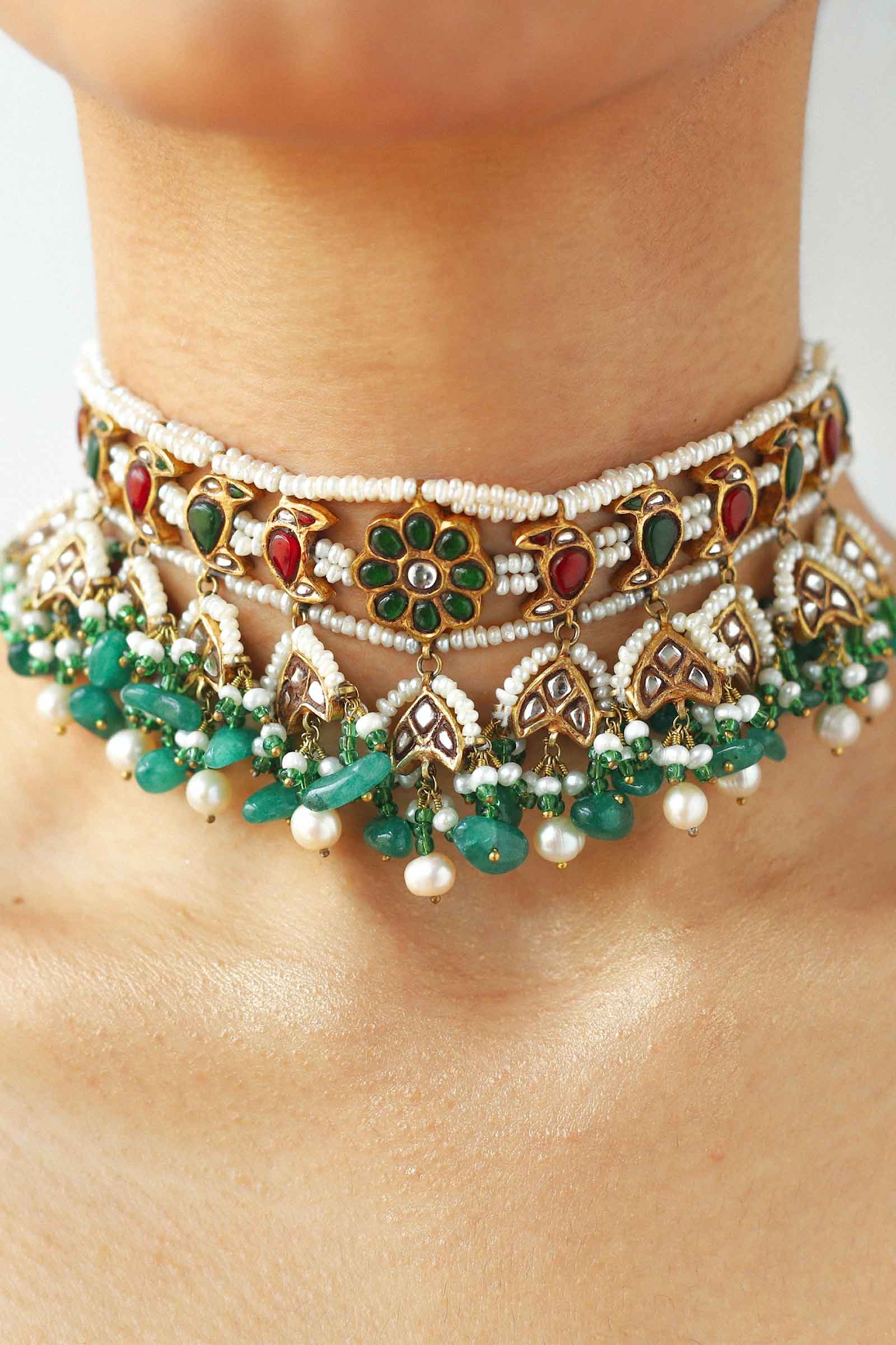 This Necklace is 22k gold plated, set in hand-picked Stone like, Zircon, Chetam, and Green Agate. Strung together with natural pearls and green Agate. Perfect for all your celebrations.