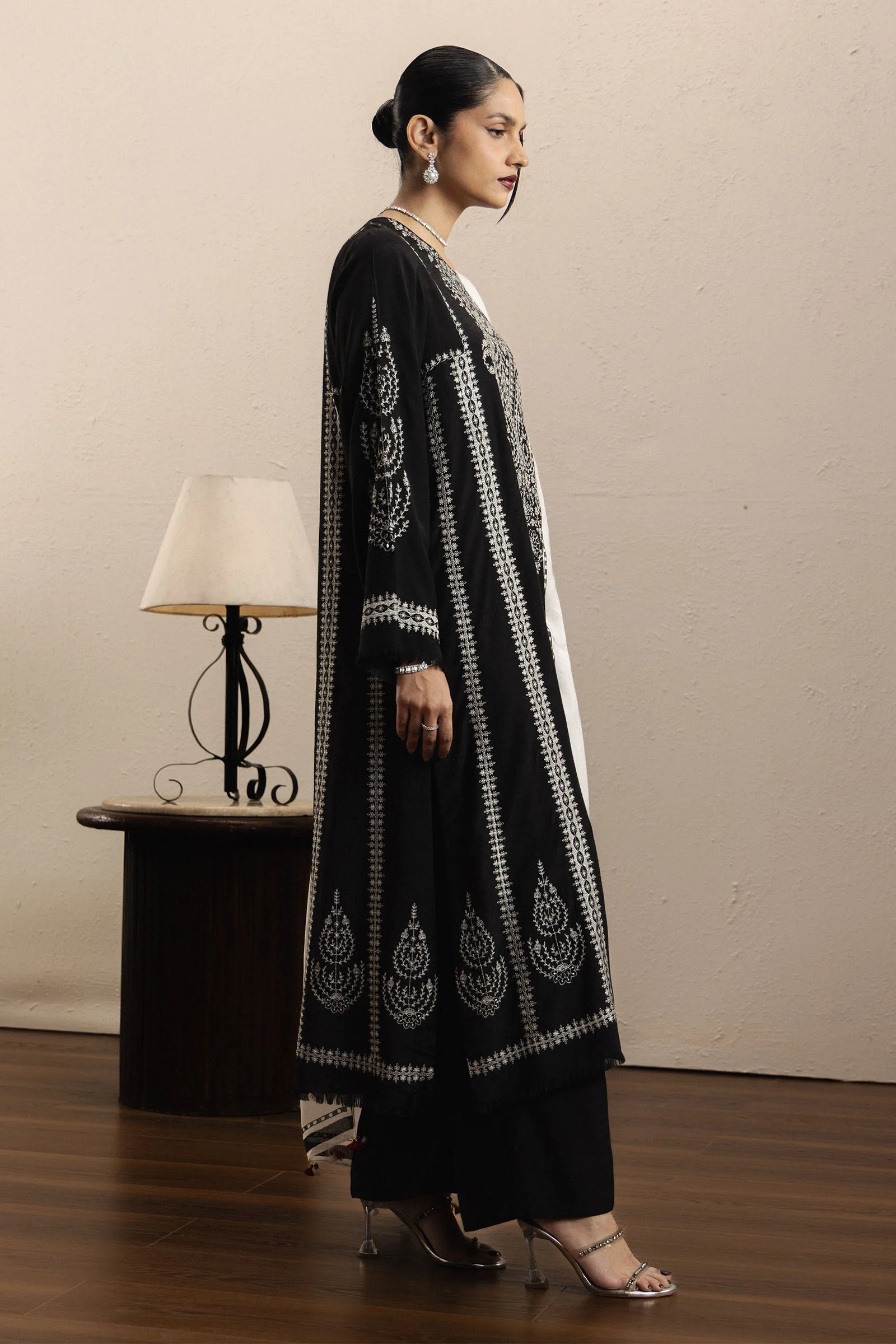 Nafasat is a timeless paneled silk Karandi ensemble that merges classic elegance with artisanal flair. The kurta is adorned with contrast-colored Kashmiri embroidery, accentuating the panels with delicate, heritage-inspired motifs. Paired with wide-hem silk Karandi pants, the silhouette is balanced, graceful, and effortlessly refined.