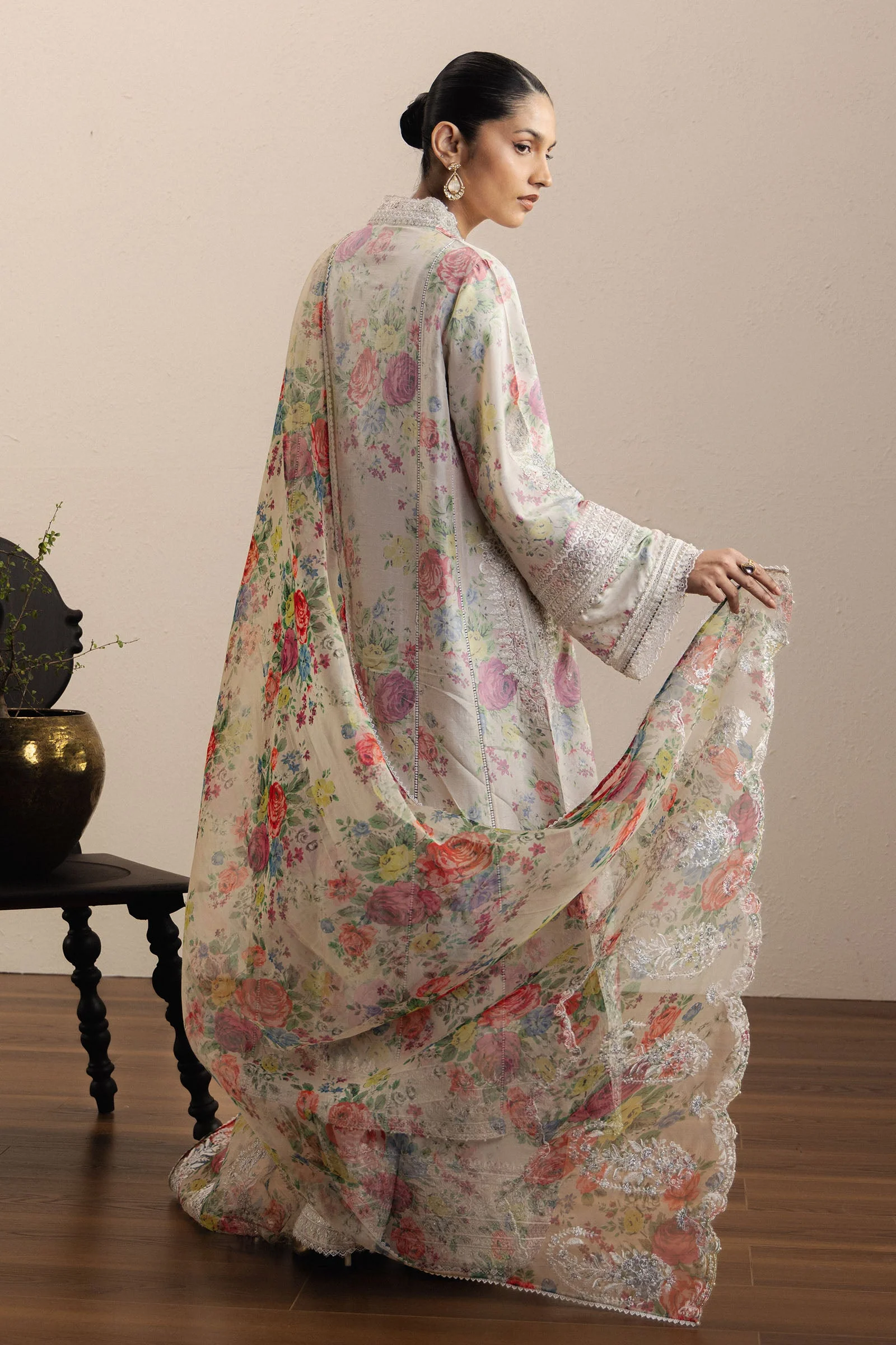 Paired with an embroidered raw silk shalwar, the silhouette remains elegant and balanced, allowing the detailing of the shirt to take centre stage. The look is completed with a luxurious organza dupatta, finished with an embroidered pallu that adds a soft, celebratory flourish.