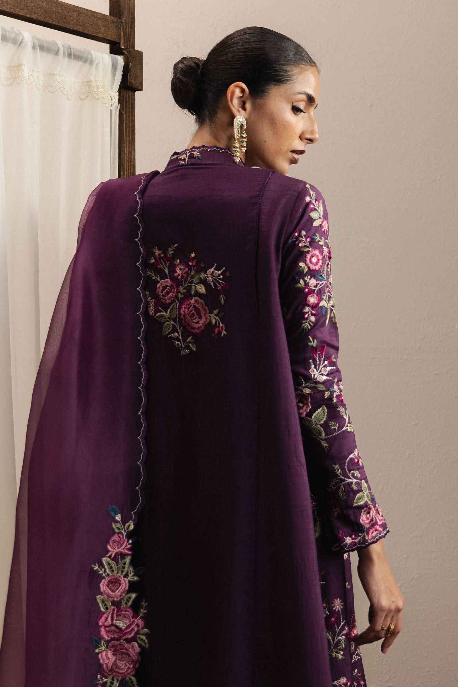 Shabnam is a luxurious plum raw silk ensemble, featuring a long, panelled kameez that elegantly balances tradition and contemporary refinement. The front and sleeves are adorned with delicate embroidery, enhanced with subtle organza accents that lend depth, texture, and a soft shimmer to the design.