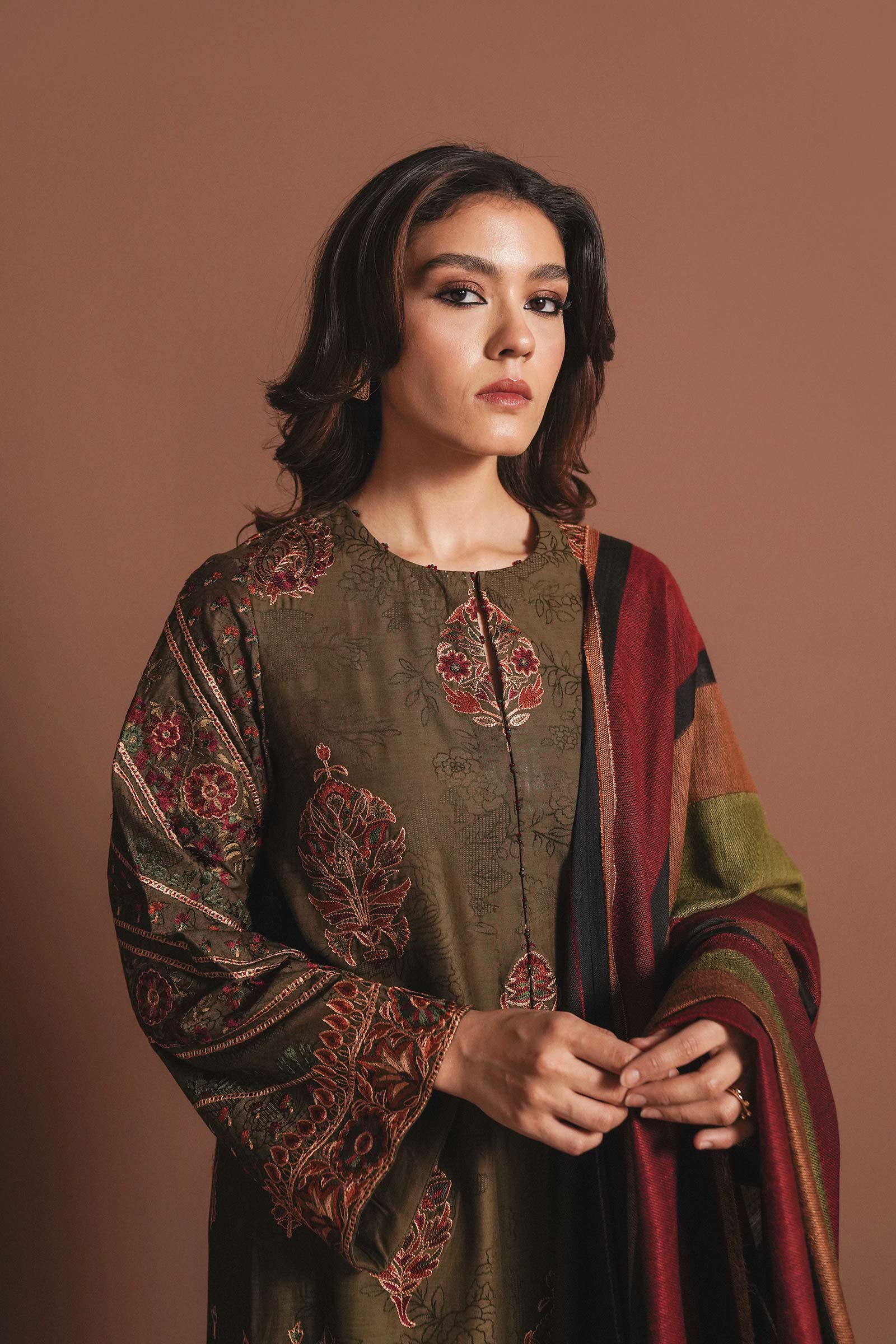 Moss green self-jacquard straight fit shirt with detailed embroidered motif spray all over and beautifully composed sleeves paired with straight pants and a beautiful jacquard shawl.