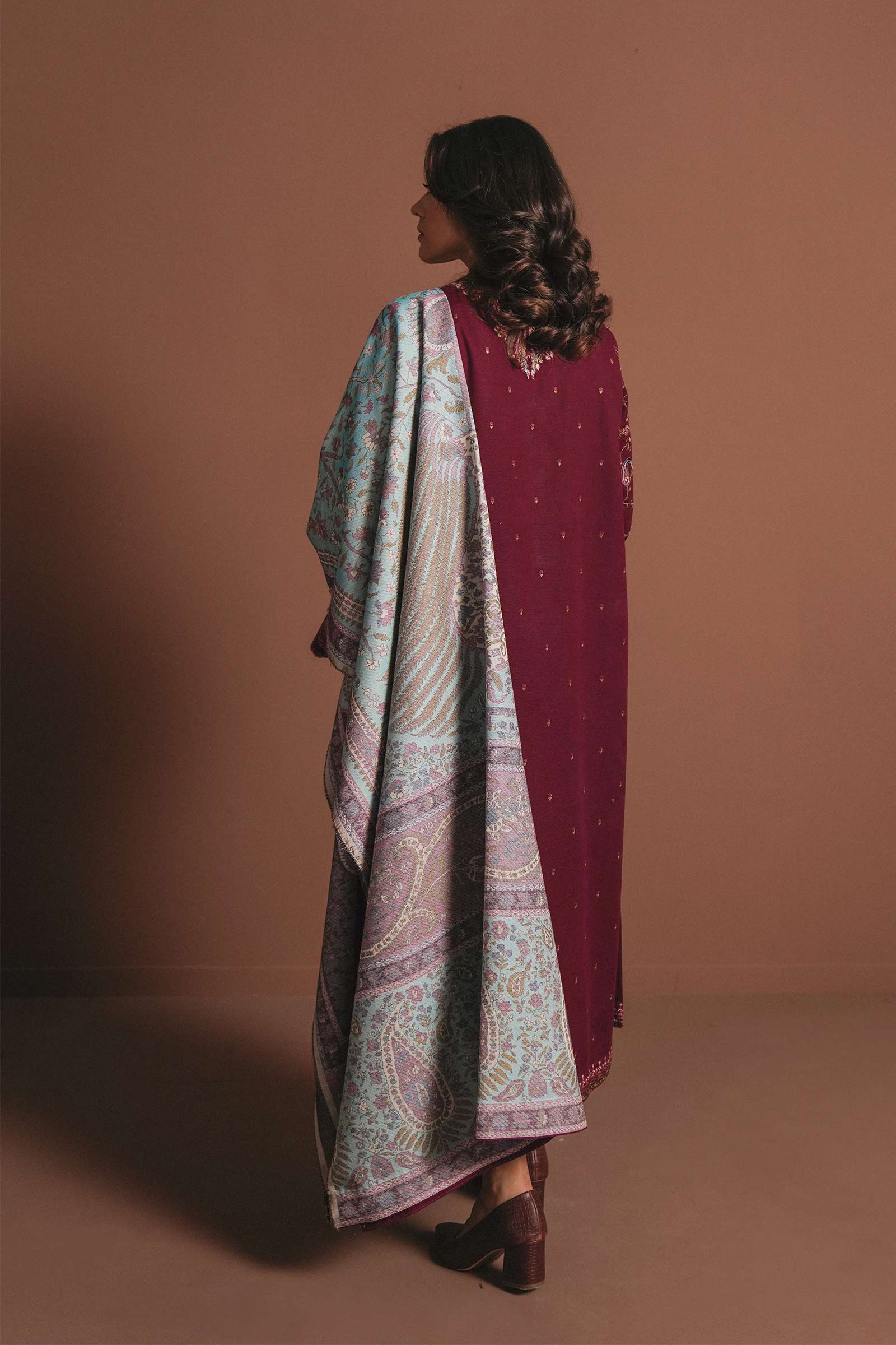 Mulberry loose fit paneled shirt with an intricate embroidered neckline with composed embroidered sleeves paired with straight pants and a customized jacquard shawl.
