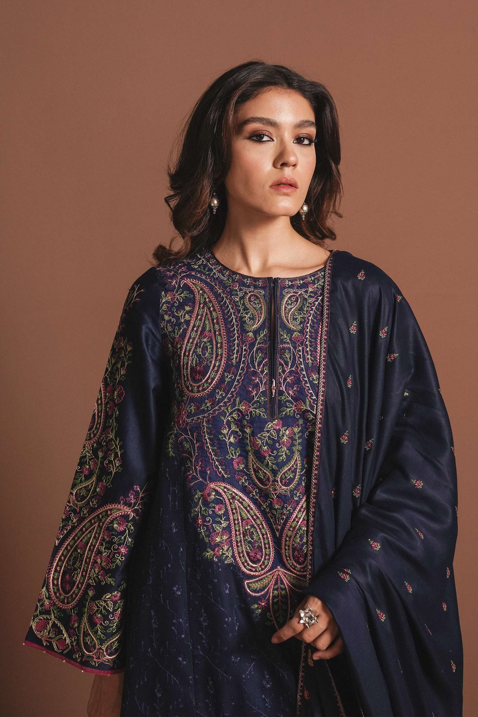 Mid night blue flared shirt embellished with over all embroidery with Kashmiri embroidered neckline and sleeves paired with cropped culottes and an embroidered shawl.