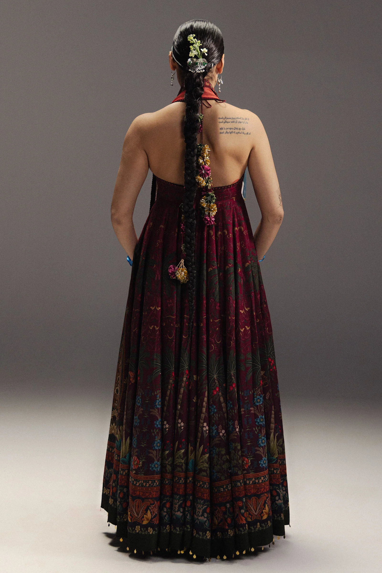 Firdaus is a majestic Kalidaar Anarkali adorned with a curated Shikargah-inspired print, featuring lush greenery against a rich burgundy base that exudes heritage grandeur. The fourteen-panel silhouette unfolds gracefully, anchored by a wide, elaborate hemline of Persian vine scrolls and structured geometric bands, adding architectural refinement. The palette harmoniously blends crimson, ochre, and forest green, subtly cooled by deep navy and midnight blue accents, creating a visually striking yet balanced ensemble. A statement silk dupatta completes the look, featuring a dark central field bordered by a vintage checkerboard and intricate floral lattice design, offering dramatic contrast and timeless artistry, making Firdaus a true masterpiece of regal craftsmanship.