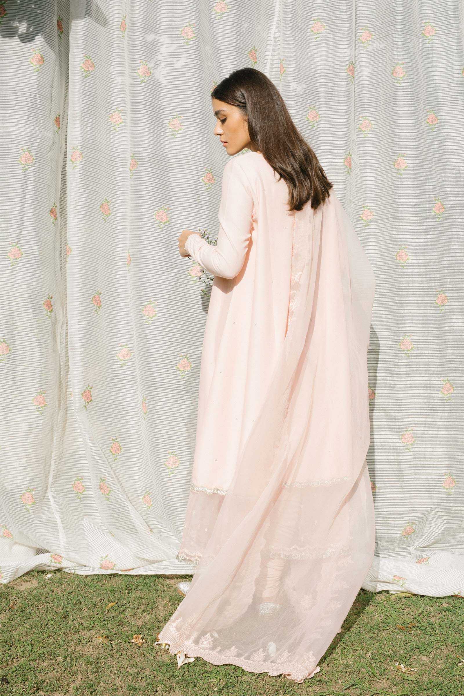 Long paneled blush pink shirt enhanced with silver tilla spray all over, pearl finishing’s and embroidered organza extension at hem, paired with a churidar and a matching dupatta with embroidered scallops.