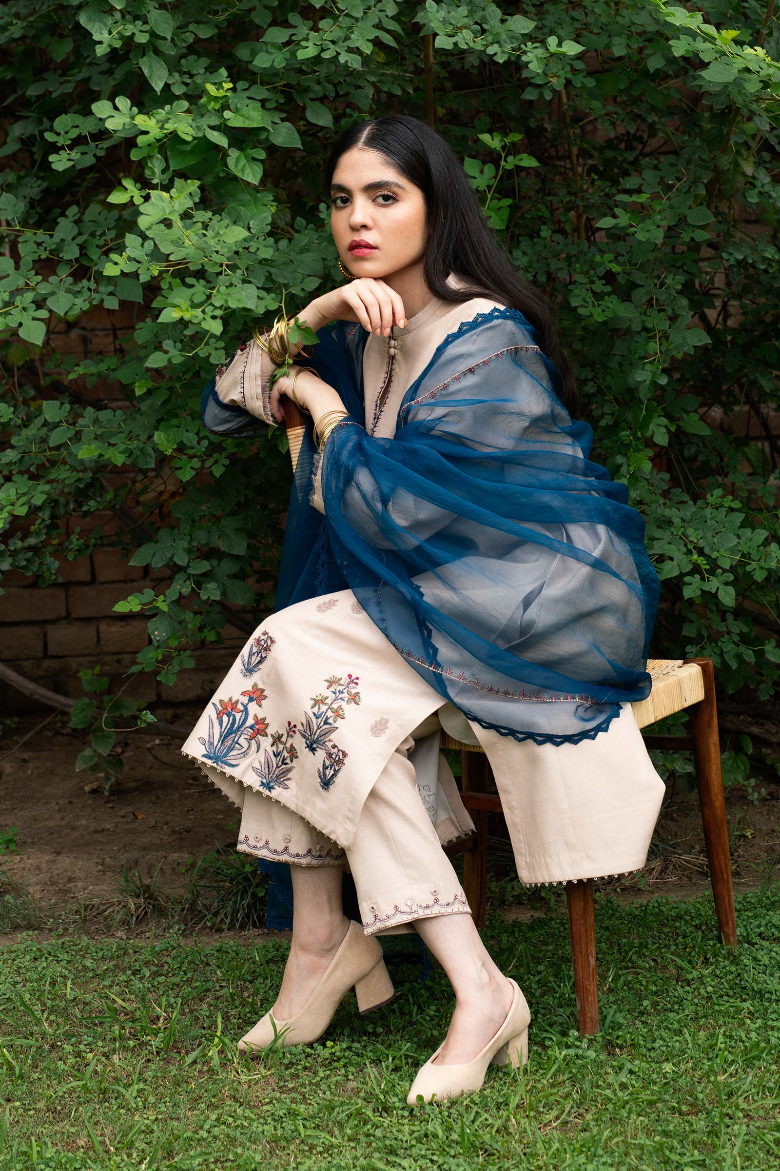 Tan long flared kalidaar with detailed embroidery on the hemline and embroidered neckline paired with straight cropped trousers and a deep navy blue dupatta.