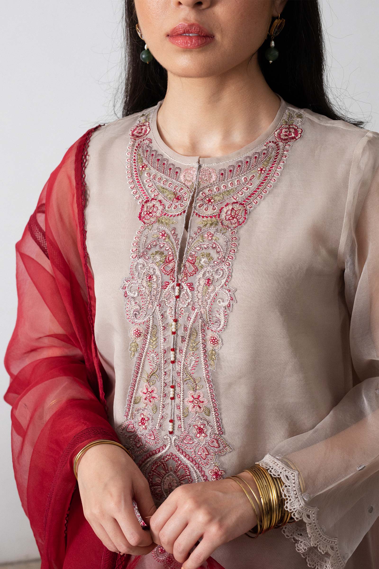 Smoke grey straight fit kurta enhanced with delicate Kashmiri embroidery on the neckline and motifs on the corner, paired with a matching undershirt, sharara pants and a burgundy dupatta.