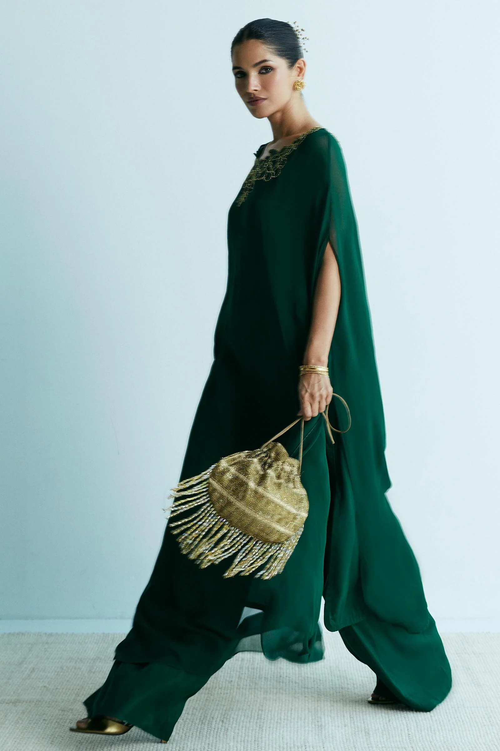 Ideal for this festive season, this bottle green cape has delicate beadwork in gold and is styled here with a thin strap slip and straight-fit trousers.