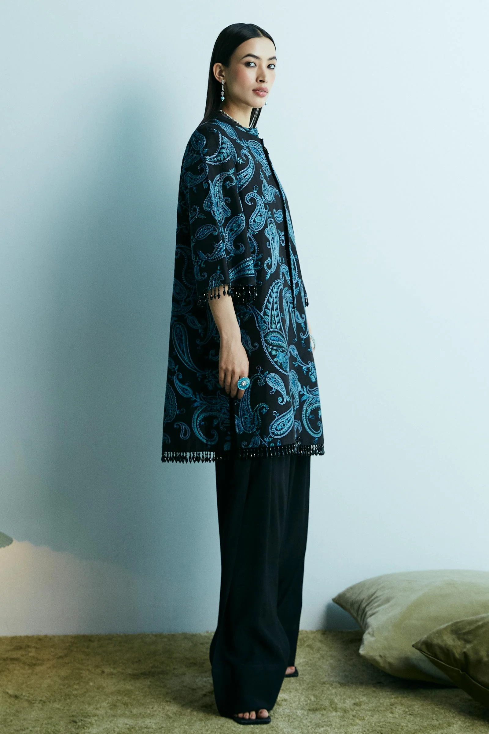 Our jacket ensemble with intricate paisleys and crystal tassels, embroidered on a black canvas is a classic choice. The pairing of this ensemble with a farshi shalwar with a thin strap slip provides the perfect finishing touch.