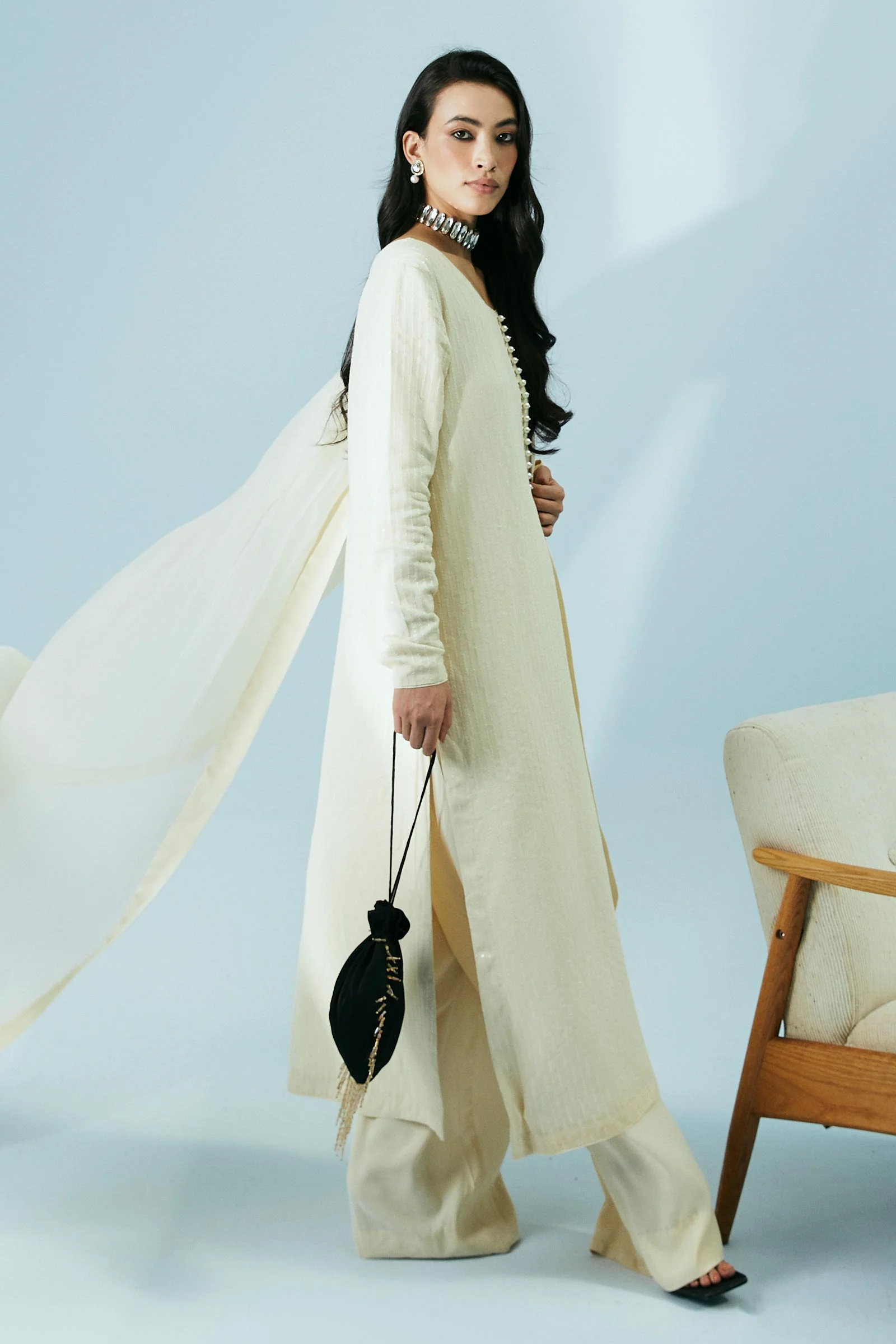 An all-time ivory set features a fitted shirt with sequin embroidery in the same ivory hue and is paired with straight trousers and a dupatta with silk finishes.