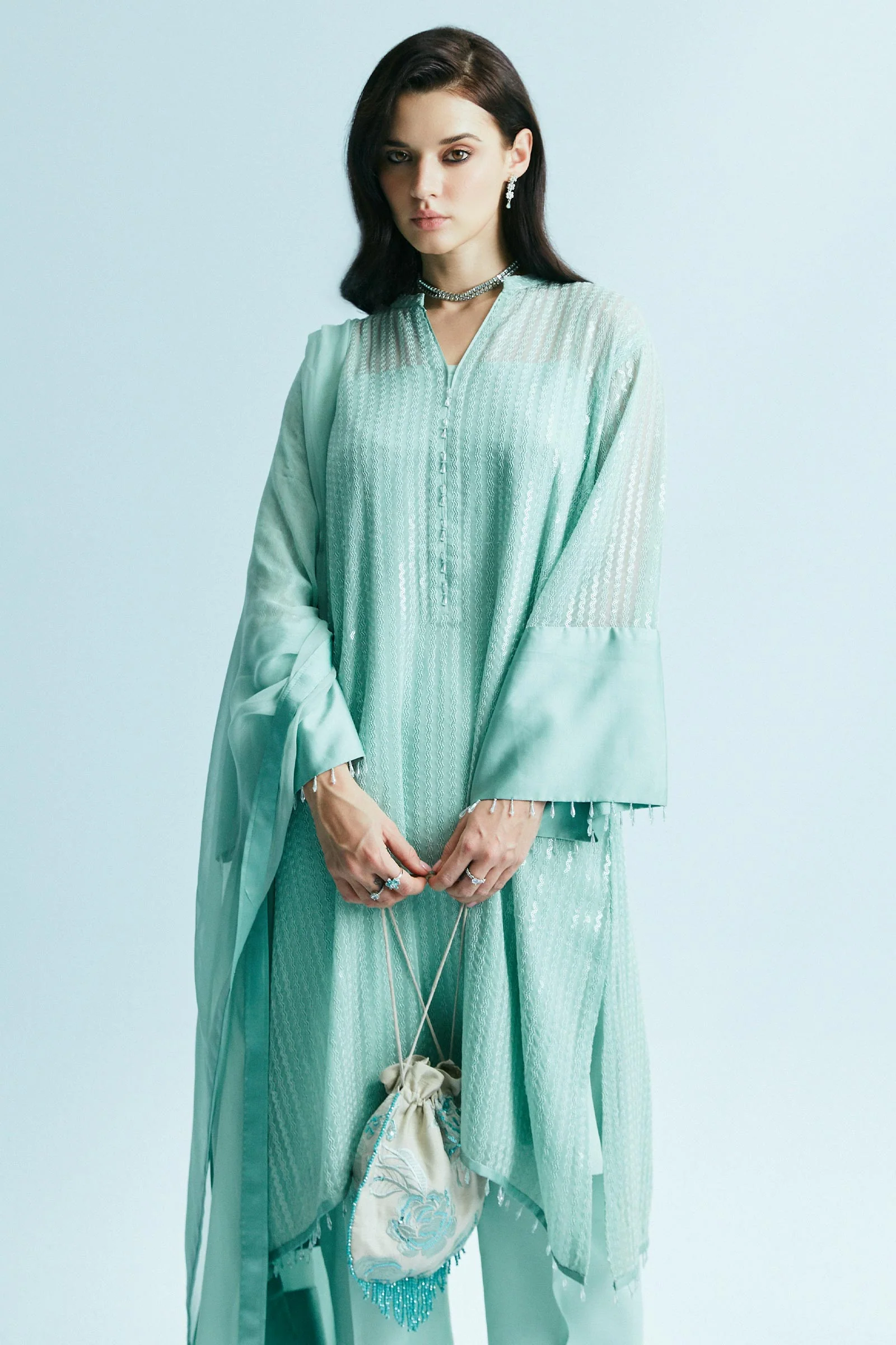 A modern-looking shirt features sequin embroidery with silk and crystal finishes. This shirt is styled with cropped pants and a silk-finished dupatta.