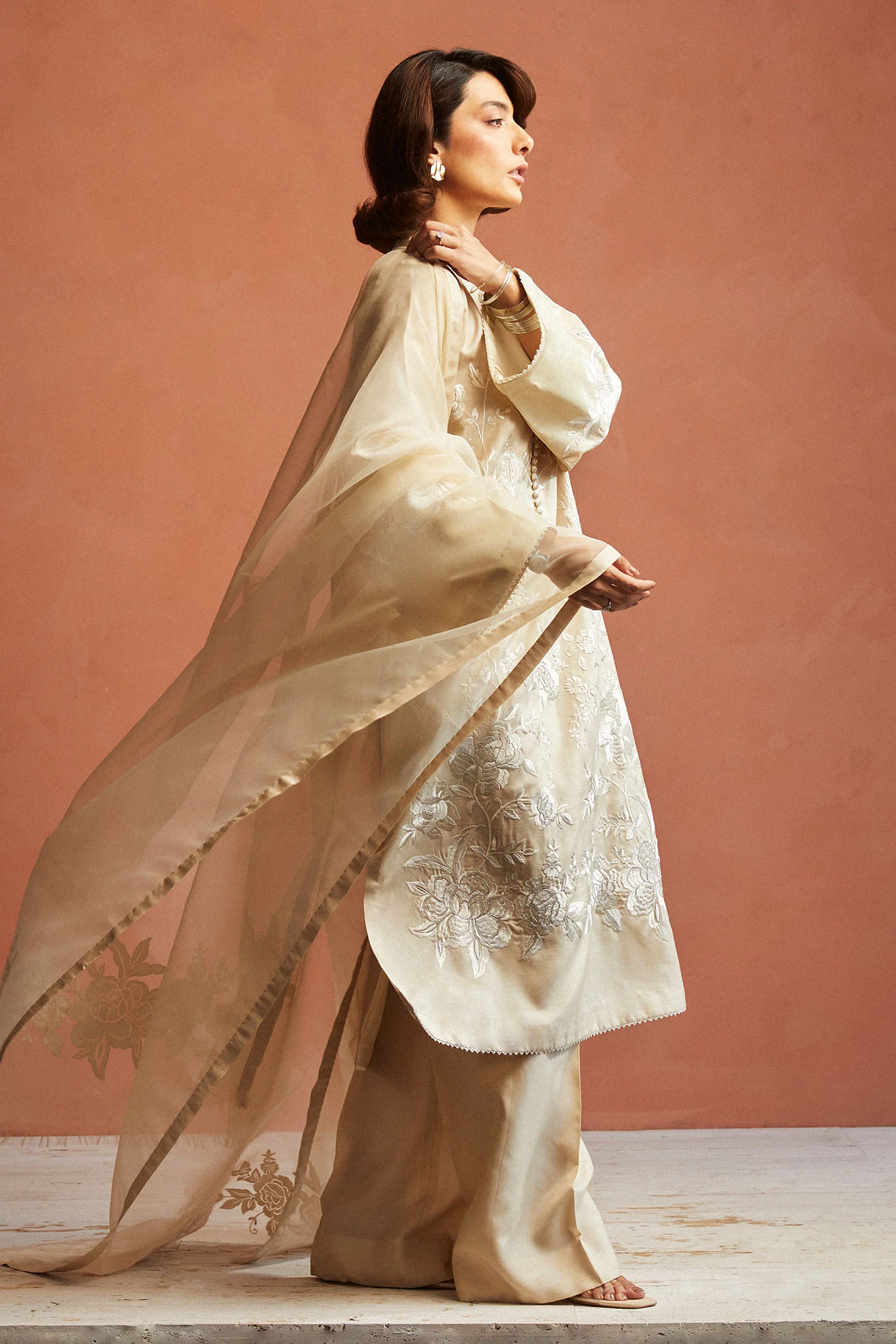 Our beige set features an elegant gara embroidered front and sleeves with crystal work. It is complemented here with an embroidered dupatta and straight pants.
