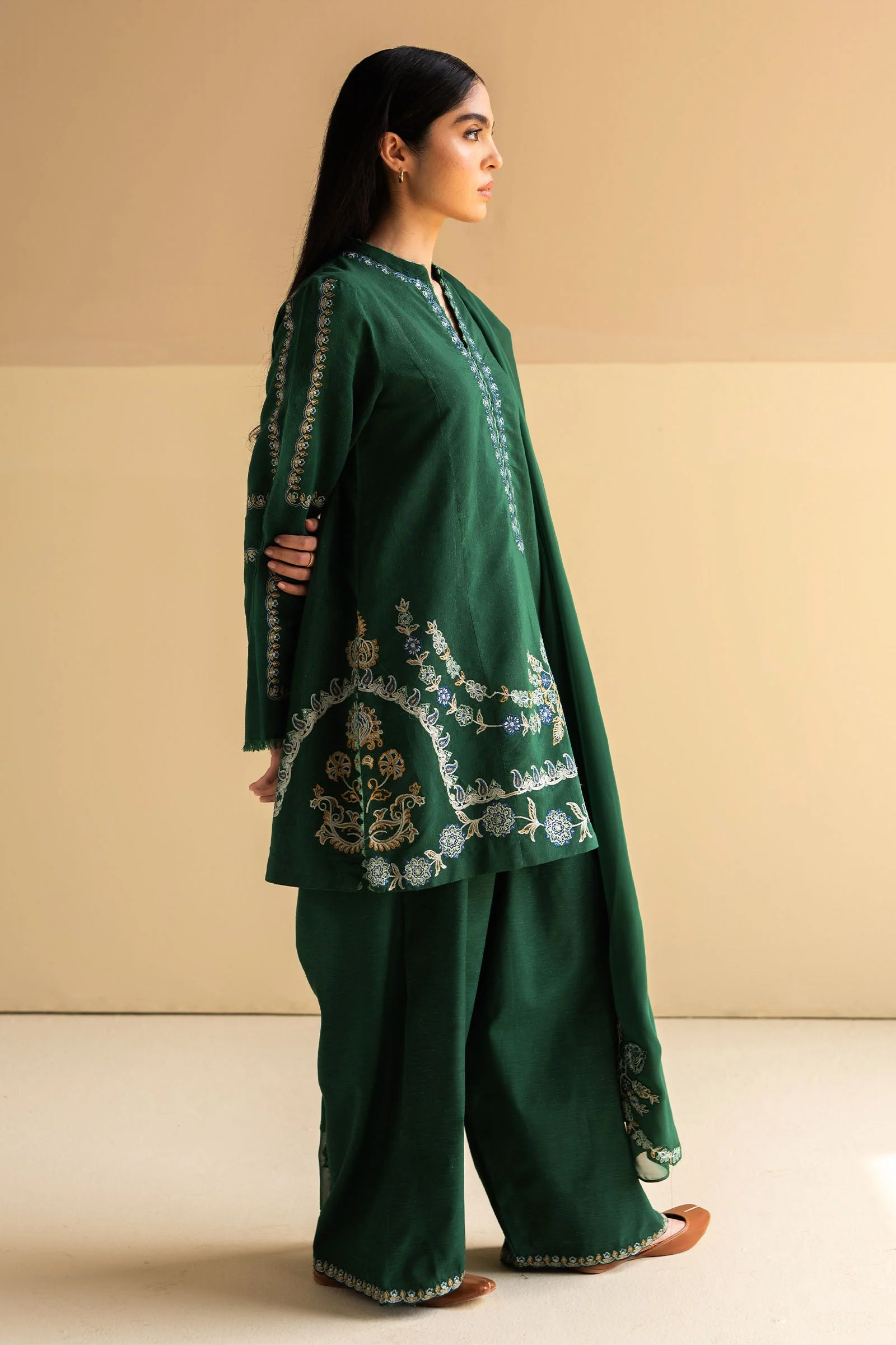 A short regular-fit kurta set paired with a farshi shalwar with embroidery details on the hemline and a dupatta in the same hue.