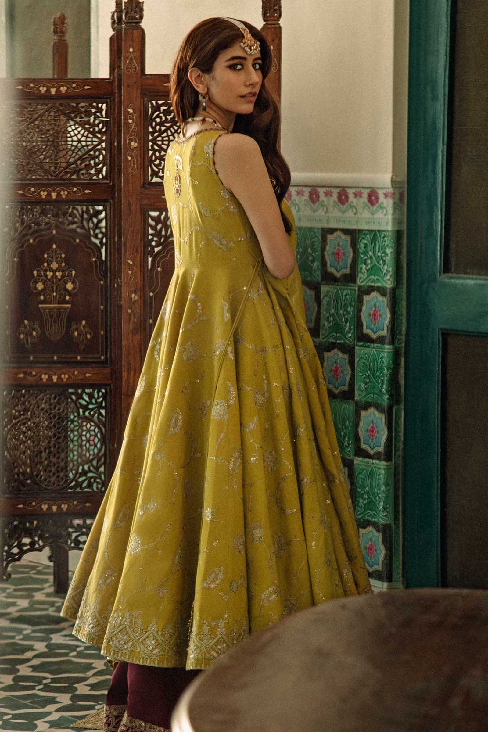 Saira wears a fully embellished classic angrakha, with a heavy border and embellished neckline. The intricate jaal on the peshwaz makes it a perfect mehndi outfit. It is paired with a flared contrasting lehnga in magenta with a mokaish dupatta and resham borders on all four sides.