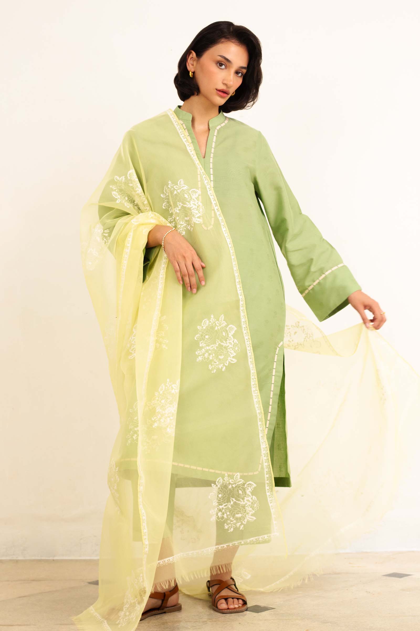 Our loose-fit leaf green kurta with dori details, paired with straight fit pants is perfect for work or beyond.